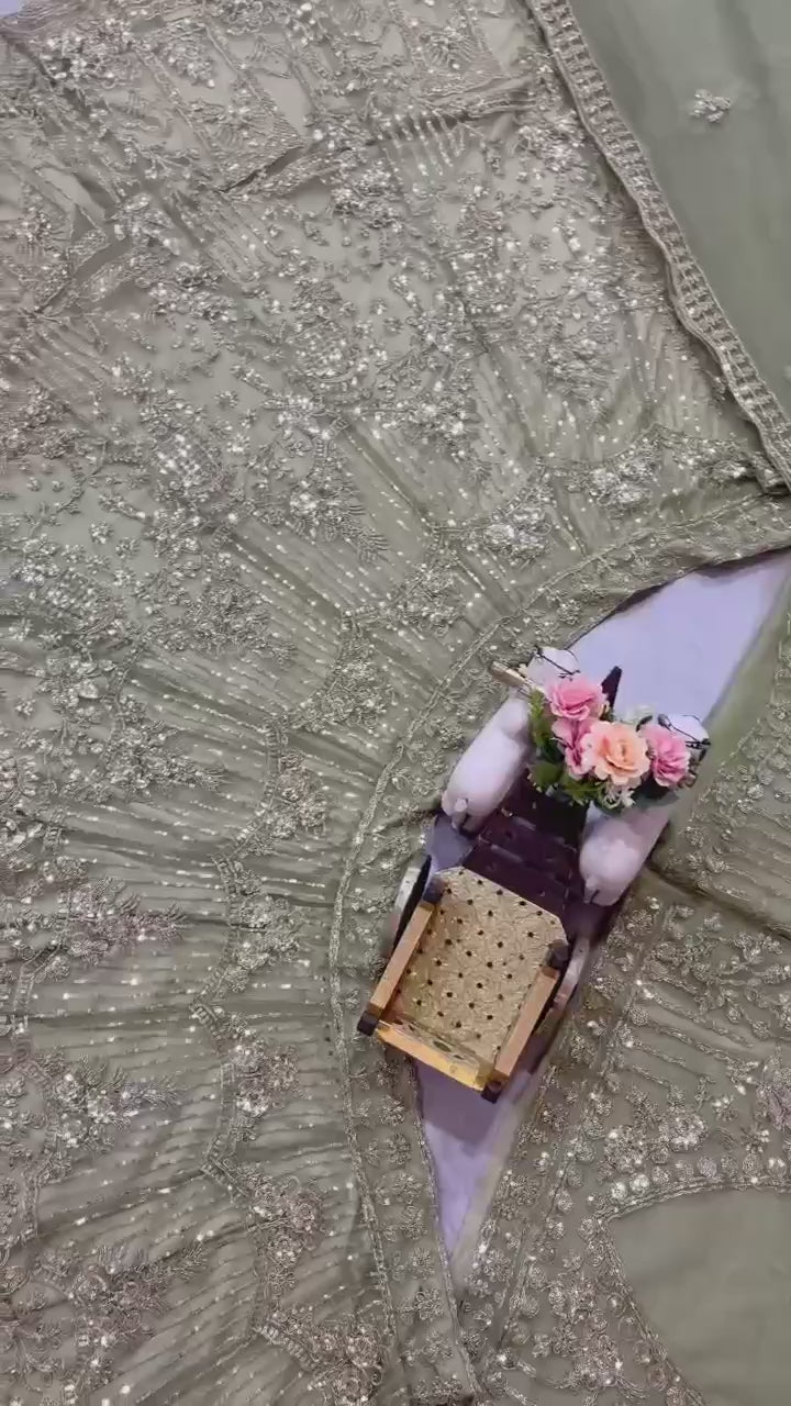 Olive Green Heavy Embroidered Net Lehenga Choli with Sequins & Zari Detailing